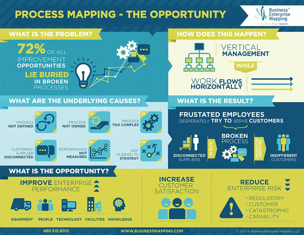 Siloed businesses are organizations that struggle to deliver their product or service with the time-efficiency and quality that the customer desires. This is because siloing isolates teams, making it difficult to generate new solutions or quickly address problems as they arise. Business Enterprise Mapping works by analyzing your workflows to create a unified process for conducting your business. This inherently helps dissolve workplace silos by creating a well-designed system involving all necessary parties, regardless of their department or elevation in the company.