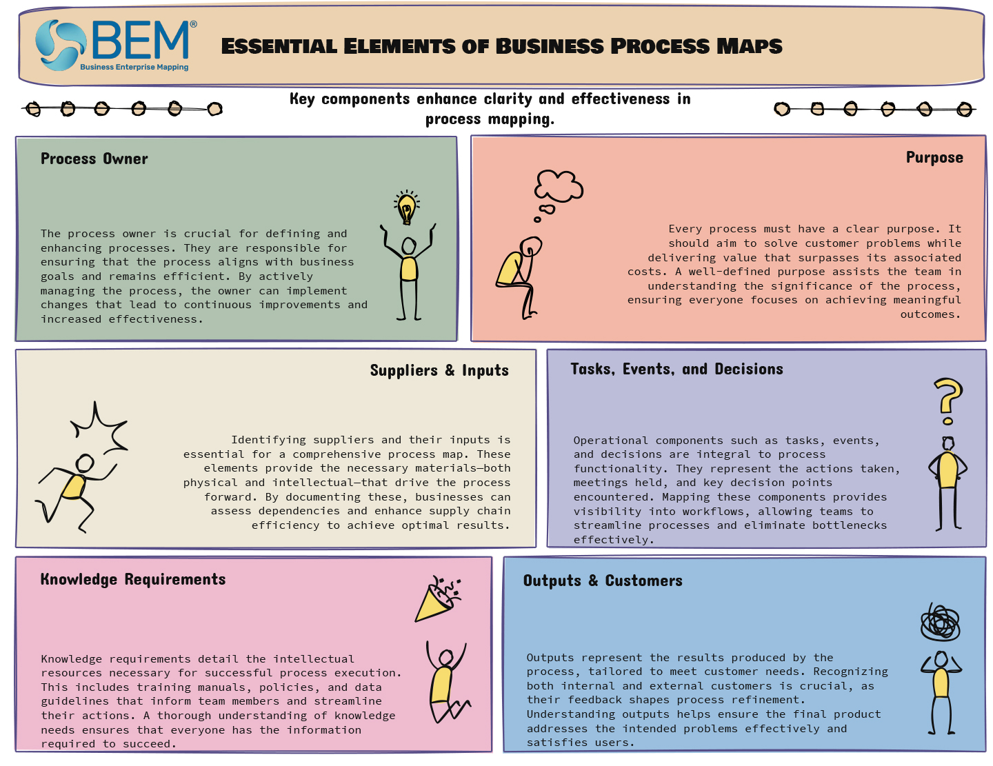 While many companies attempt process mapping, the lack of a universal standard often leads to inconsistency. Business Enterprise Mapping (BEM) suggests every process map include the following key elements: